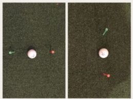 Long irons, hybrids and fairway woods can be frustrating to hit. Making solid contact with these clubs is crucial to staying in the fairway. Set up a practice station with alignment rods, tees and a ball marker or an extra tee works also, as shown in the pictures(Place the forward tee or marker 4 inches in front of the ball). If you are hitting your longer clubs fat choke down on the grip about and inch, you may lose a little distance but will gain accuracy which will lead to lower scores. The first few swings will be without a ball so replace the ball with a tee instead. You want to hit both tees during the swing. After you have gotten 6 good swings in a row add a ball now. The goal is still the same, hit the ball then the forward tee or ball maker. This drill also helps you find your swing bottom as you want to contact the ball, then the ground generally 4 inches after the ball.